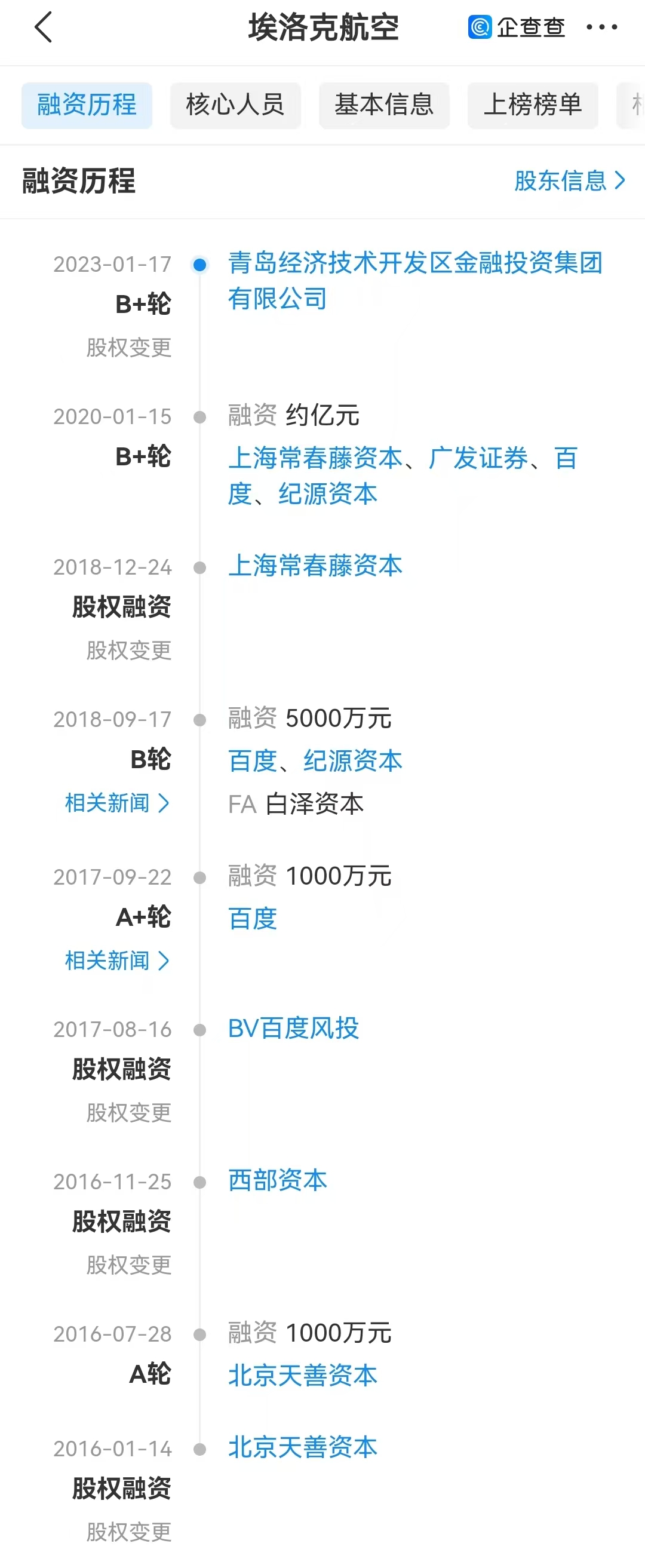2016年1月14日,埃洛克航空获得北京天善资本股权融资;2016年7月28日,获得来自北京天善资本的A轮融资1000万元;2016年11月25日,获得西部资本股权融资;2017年8月16日,获得BV百度风投股权融资;2017年9月22日,获得百度A+轮融资1000万元;2018年9月17日,获得百度、纪源资本、白泽资本B轮融资5000万元;2018年12月24日,获得上海常春藤资本股权融资;2020年1月15日,获得上海常春藤资本、广发证券、百度、纪源资本B+轮约亿元融资;2023年1月17日,获得青岛经开区金投集团B+轮股权融资,青岛经开区金投集团持股比例由9.09%上升为15.03%。