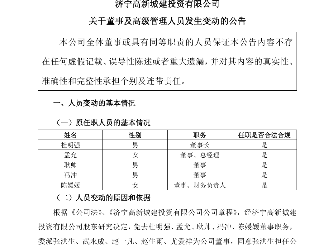 1月14日,济宁高新城建投资有限公司(下称“济宁高新城投”)公告称,解聘孟允总经理职务,聘任武永成为公司总经理,聘任魏艳文为公司财务负责人,选举张洪生为公司董事长。