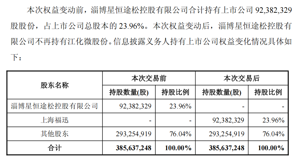 上述交易完成后,淄博星恒将不再持有江化微的股份,江化微控股股东将变为上海福迅,实控人将由淄博市财政局变更为上海市国资委。