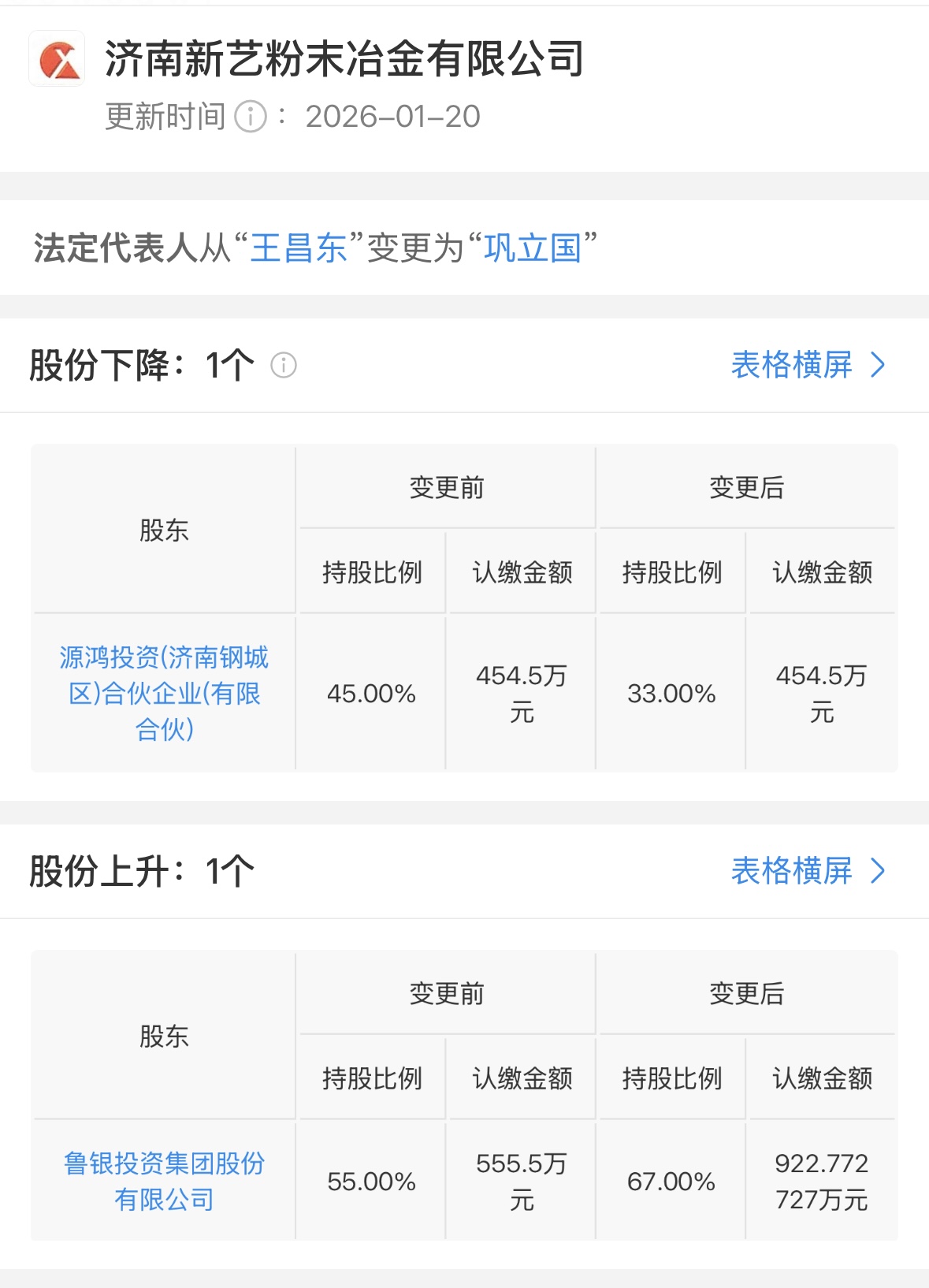 变更信息显示,新艺粉末注册资本从1010万元变为1377.27万元,增加367.27万元,大股东鲁银投资持股比例由55%增加到67%,二股东源鸿投资(济南钢城区)合伙企业(有限合伙)持股比例由45%降低到33%。此外,新艺粉末经理、董事巩立国调整为董事长,原董事长王昌东退出,法定代表人由王昌东变更为巩立国,公司新增尚勇为经理、董事。