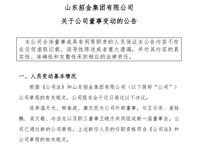 1月20日,山东招金集团有限公司(下称“招金集团”)发布关于公司董事变动的公告称,公司股东会于近日选举温天光、柳春波、康杰民为公司外部董事,与王乐译、姜桂鹏、栾文敬、冷启龙以及职工董事王晓杰共同组成新一届董事会。