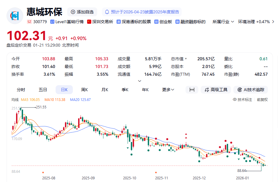 从二级市场来看,自2024年8月以来,惠城环保股价一路震荡上行,从每股40余元飙升至2025年7月251.65元/股的历史高点。不过,在2025年7月11日见顶后,该股不断波动回落。