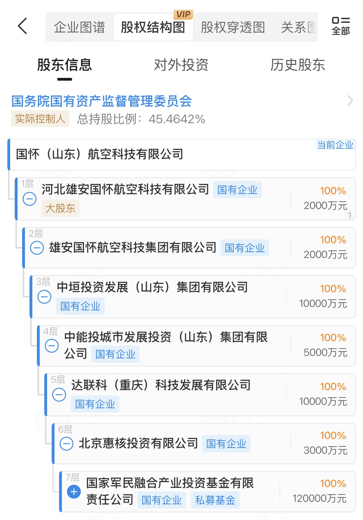 股权穿透显示,河北雄安国怀航空科技有限公司为国怀(山东)航空科技有限公司母公司,持股100%。股权结构显示,国怀(山东)航空科技有限公司实际控制人为国务院国资委(总持股比例45.46%)。