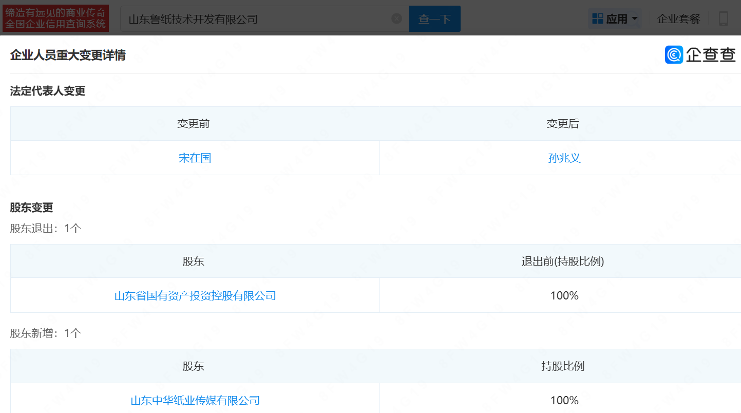 企查查显示,1月20日,山东省国有资产投资控股有限公司(下称“山东国投”)退出山东鲁纸技术开发有限公司(下称“山东鲁纸”),退出前持股比例为100%。该部分股权全部由山东中华纸业传媒有限公司(下称“山东中华纸业”)接手。