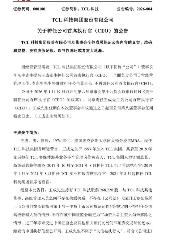 1月22日午间消息,TCL科技日前发布公告称,公司董事会已审议通过聘任王成担任首席执行官(CEO)的议案,全面负责公司日常经营管理工作。这意味着创始人李东生将卸下兼任的CEO职务,仅保留董事长一职。