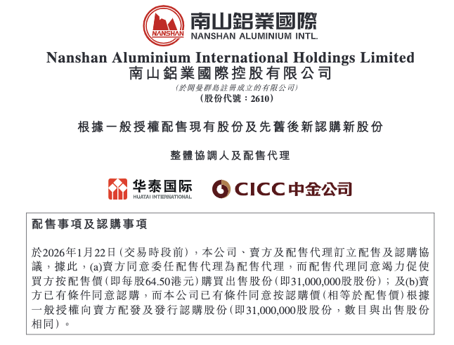 公告显示,公司与卖方Nanshan Aluminium Investment Holding Limited及配售代理订立配售及认购协议,拟同步启动旧股配售与新股认购配套操作。