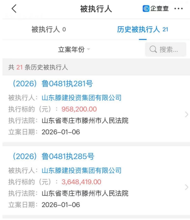 业绩波动的背后,山东滕建集团的司法风险正逐步凸显。企查查显示,1月6日,山东滕建集团两次被滕州市人民法院列为被执行人,被执行总金额为460.66万元。此前,2025年12月公司也被滕州市人民法院列为被执行人。自2025年以来,公司前后17次被法院列入被执行人名单,累计被执行金额达2112.63万元。