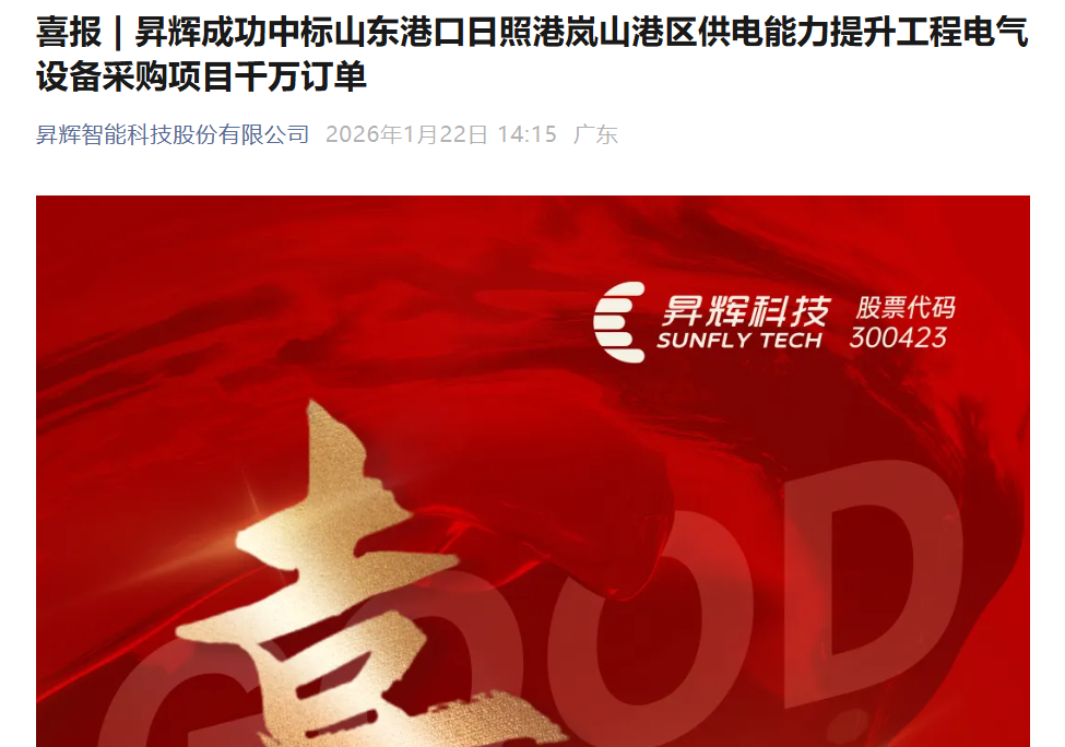 1月22日,昇辉科技(300423.SZ)在微信公众号上发布信息称,中标山东港口日照港岚山港区供电能力提升工程电气设备采购项目千万订单。