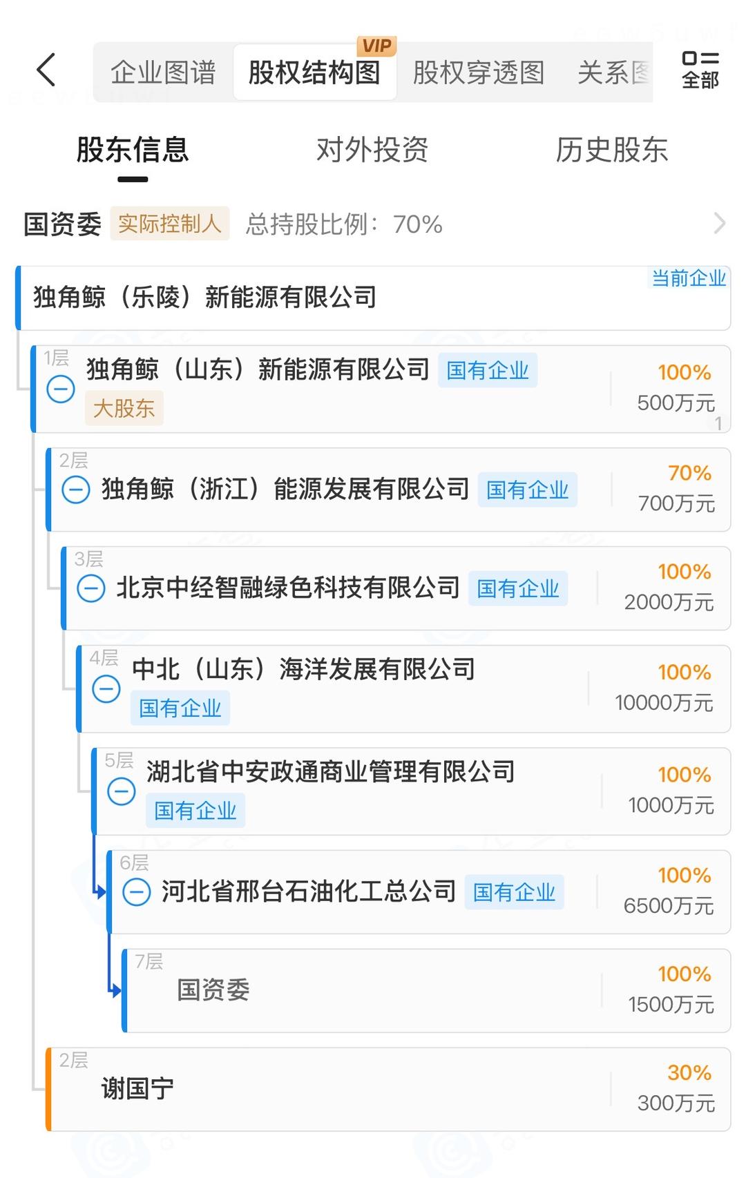 独角鲸(山东)新能源有限公司成立于2025年9月,注册资本1000万元,法定代表人谢国宁,企查查显示该公司为“国企”,实际控制人显示为“国资委”。股权穿透显示,独角鲸(浙江)能源发展有限公司与谢国宁分别持股70%、30%。