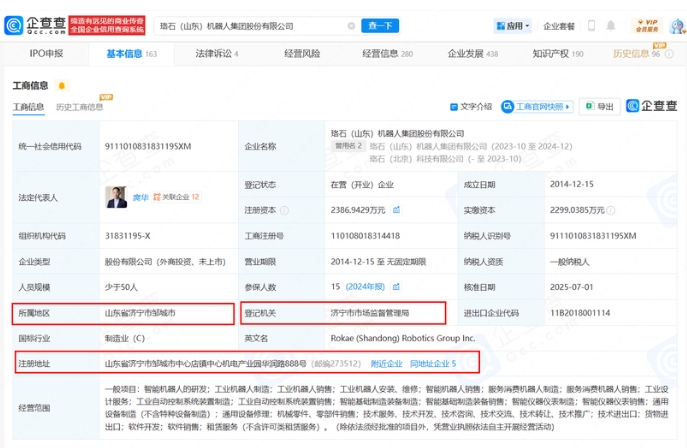 公开信息显示,珞石机器人成立于2014年12月,法定代表人为庹华,注册资本为2386.94万元,前身为珞石(北京)科技有限公司,2023年10月,公司正式将总部从北京市海淀区迁至山东省济宁市邹城。