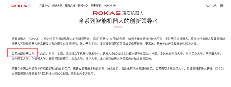 经济导报记者注意到,在上述榜单刚发布时,珞石机器人的总部城市被标注为“北京”,并未被列为山东企业,这与该公司官网标注的“公司总部位于山东”及实际注册地位于山东济宁邹城的信息存在差异。就归属地认定问题,经济导报记者已于1月21日分别向胡润研究院及珞石机器人进行问询。胡润研究院方面表示,现已将珞石机器人总部归属地更新为“山东”。