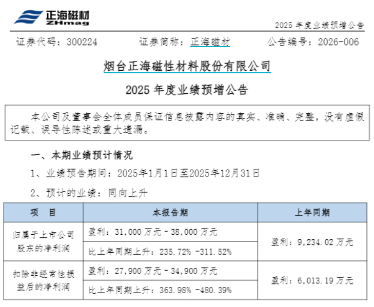 值得关注的是,1月15日,正海磁材发布2025年度业绩预告,预计全年归属于上市公司股东的净利润为3.1亿元至3.8亿元,同比增长235.72%至311.52%;扣除非经常性损益后的净利润预计为2.79亿元至3.49亿元,同比增长363.98%至480.39%。