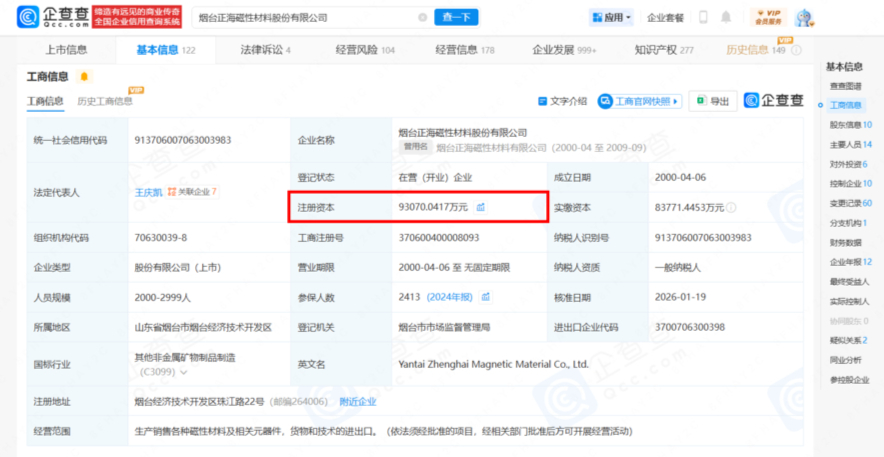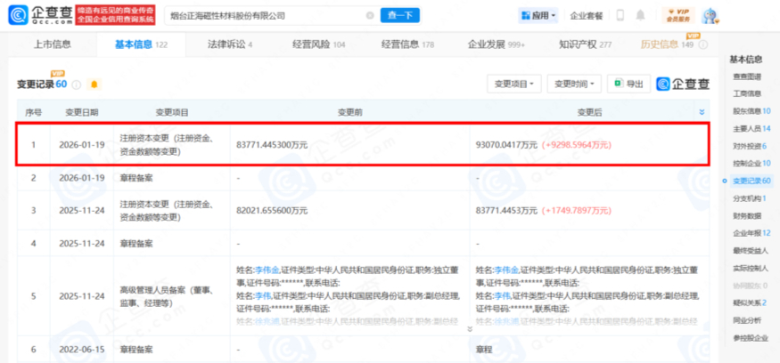 正海磁材注册资本增至9.3亿元,2025年净利预增超2.3倍