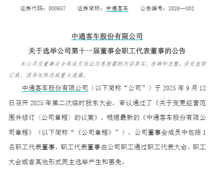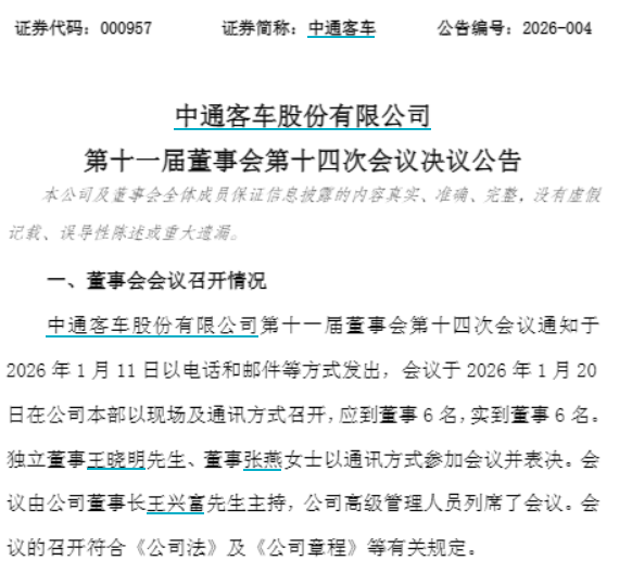 此外,中通客车公告称,公司定于2月6日召开第一次临时股东会,采用现场与网络投票相结合的方式,对非独立董事候选人、关联交易预计、公司章程修订等议案进行审议,股权登记日为1月30日。