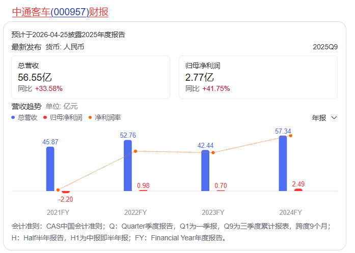 财务数据显示,2024年,中通客车实现营收57.34亿元,同比增长35.11%;归属上市公司股东净利润2.49亿元,同比增长258.12%。2025年前三季度,公司业绩延续增长势头,实现营业总收入56.55亿元,同比增长33.58%;归母净利润2.77亿元,同比增长41.75%。