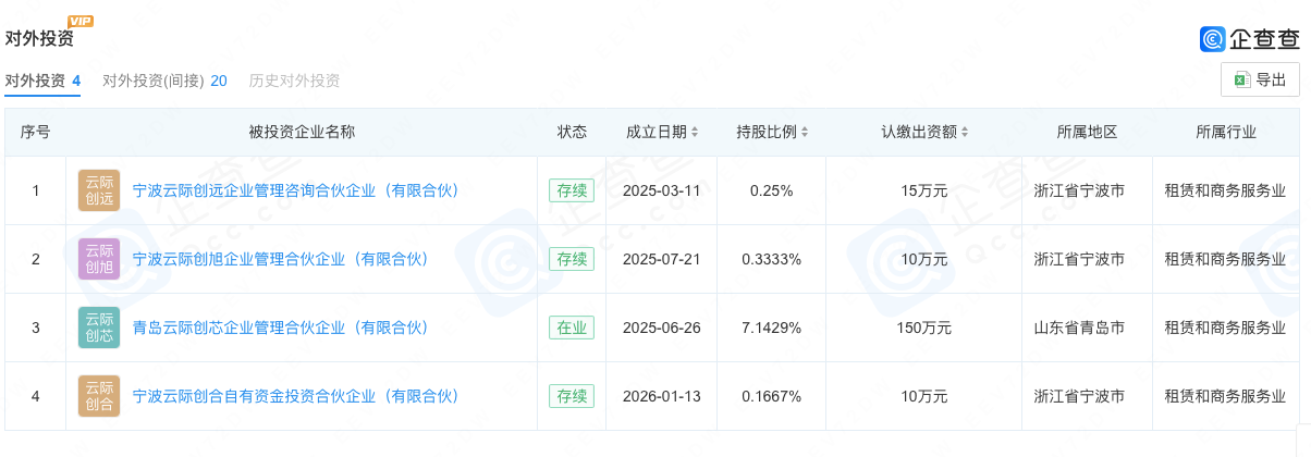 2024年11月,王伟修家族的资本平台山东中际投资控股有限公司(下称“中际投资”),认缴出资7000万元投向烟台源禾股权投资基金管理有限公司旗下产品。2025年,中际投资又与王晓东合资成立了上海云际天泽企业管理有限公司(下称“云际天泽”),此后,中际投资、云际天泽与王晓东陆续合资成立了4家合伙企业。
