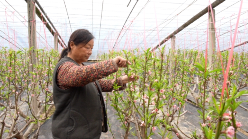 1月22日,在山东冠县兰沃乡大曲村油桃大棚基地内,红艳艳的油桃花开满枝头,果农李妹真正忙着为果树疏花疏果,确保今年丰产丰收。“中油4号这个品种上市早、口感甜、产量高,果形也好看,预计3月15日左右就能上市。”李妹真高兴地说,“去年每斤7元到8元,一棚产量5000到6000斤,一年一个大棚收入3万多块钱。俺家这5个棚,一年收入就达十五六万元。”