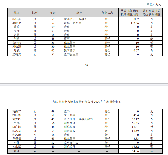 2024年年报显示,龙源技术董监高2024年合计领取报酬743.6万元。其中,董事、总经理梁成永薪酬最高,为112.36万元,副总经理牛涛、闫广涛的薪酬分别是96.35万元、85.61万元。