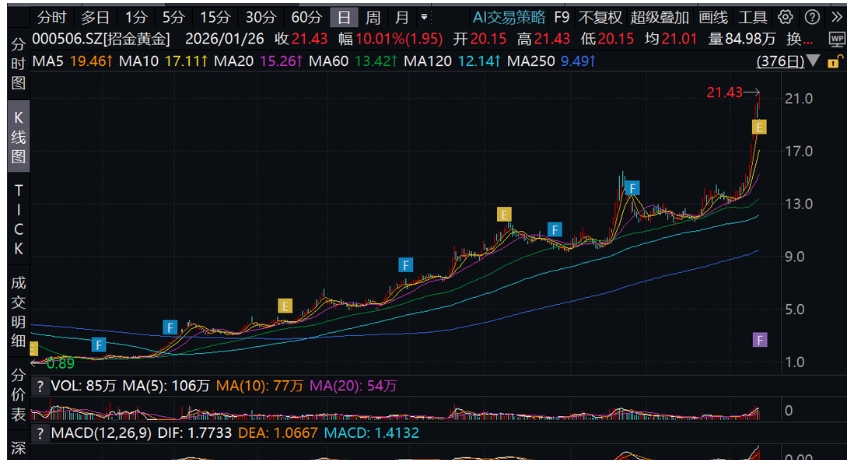 与业绩预增同样吸睛的是,招金黄金在二级市场上的强劲表现。公司股价从2024年7月11日的最低点0.89元/股一路上涨。2026年1月26日,该股“10cm”涨停,报收于21.43元/股。即18个月时间,公司股价暴涨超20倍。