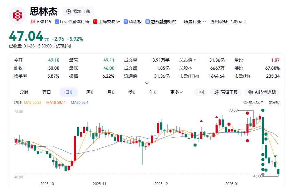 受终止收购信息影响,截至1月26日收盘,思林杰报47.04元/股,下跌5.92%,总市值31.36亿元。