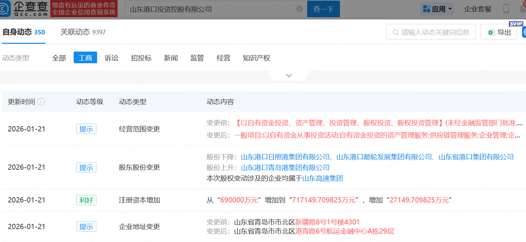 企查查显示,日前,山东港口投资控股有限公司(下称“山港投控”)发生多项工商变更,包括注册资本增加、股东股份变更、经营范围变更等。