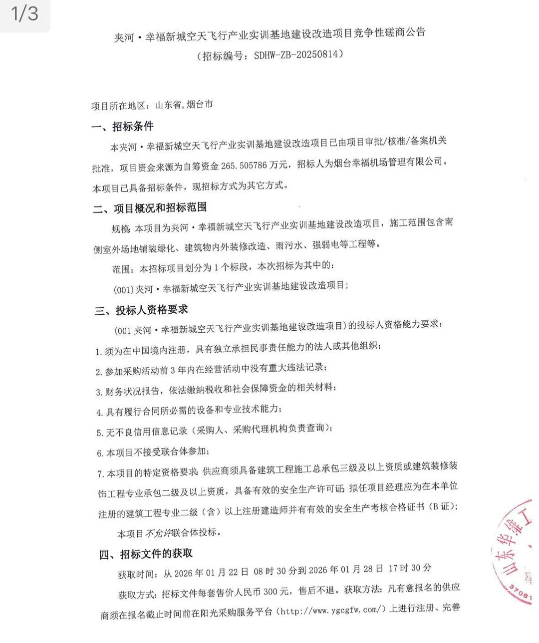 烟台幸福机场管理有限公司日前发布了“夹河·幸福新城空天飞行产业实训基地建设改造项目竞争性磋商公告”,标志着该实训基地改造又往前推进了一步。