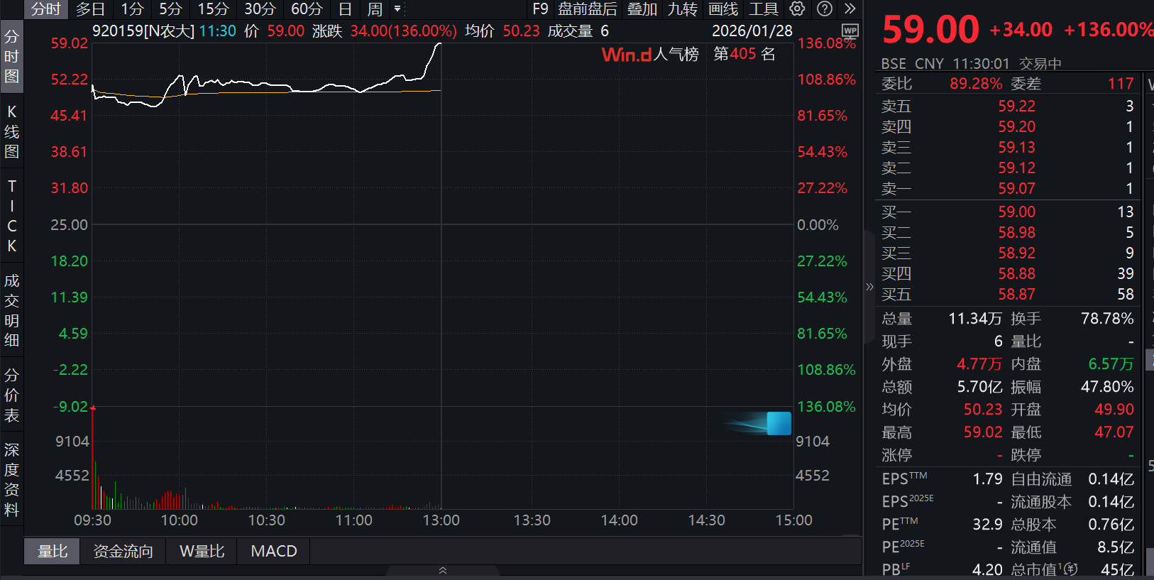 开盘后,农大科技股价呈上涨态势,截至1月28日中午收盘上涨136%,股价为59元/股。