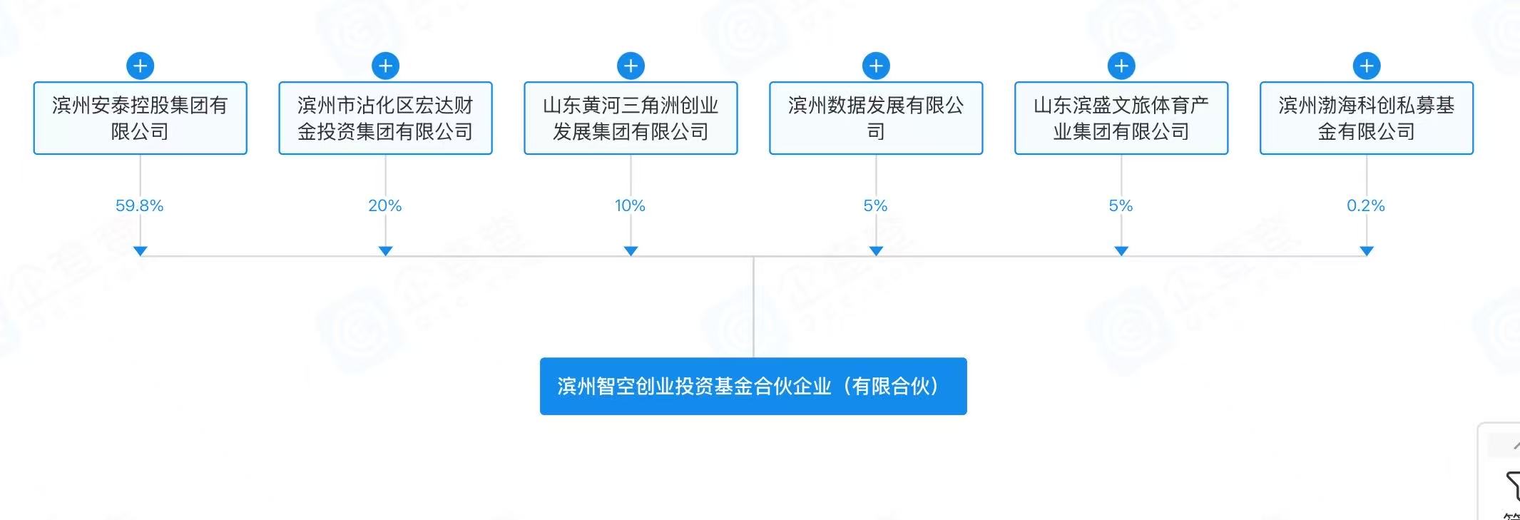 从出资比例来看,滨州安泰控股集团有限公司、滨州市沾化区宏达财金投资集团有限公司、山东黄河三角洲创业发展集团有限公司、滨州数据发展有限公司、山东滨盛文旅体育产业集团有限公司、滨州渤海科创私募基金有限公司分别持股59.8%、20%、10%、5%、5%、0.2%。