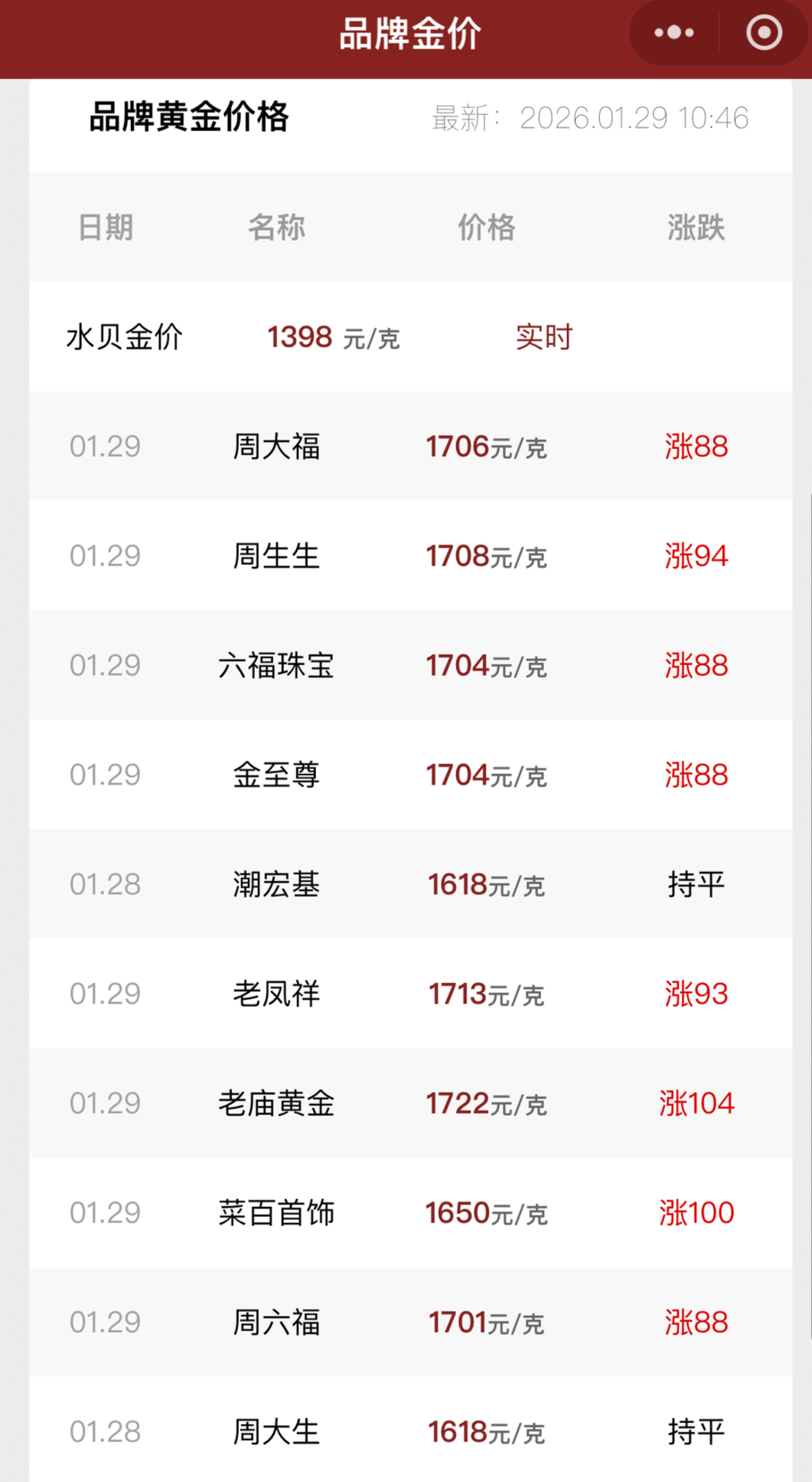另外,国内黄金饰品价格也水涨船高。其中,周大福、周生生、老庙黄金等品牌黄金克价突破1700元,老庙黄金达到1722元/克,较前一日上涨104元。