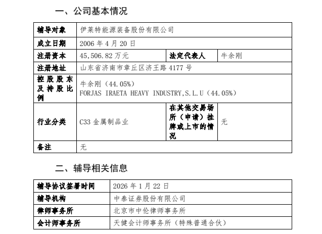 1月28日,伊莱特能源装备股份有限公司(下称“伊莱特”)在山东证监局进行辅导备案,辅导机构为中泰证券。