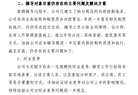 对于仍存在的相关问题,其中提及,“公司与关联方存在一定规模的同业竞争,辅导工作小组将采取实地查看、访谈主要人员,以及查验分析客户、供应商、员工等是否重叠的方式,详细论证同业竞争对公司上市的影响情况,持续协助公司对同业竞争问题进一步规范。”
