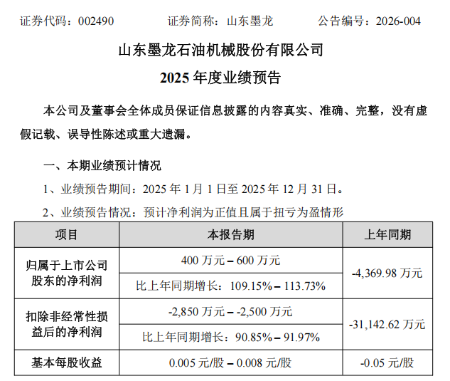 1月28日,山东墨龙(002490.SZ,00568.HK)发布2025年度业绩预告,公司预计全年实现净利润为正值,成功扭亏为盈。
