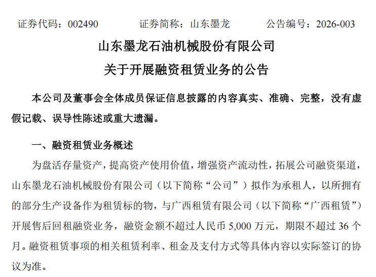 山东墨龙表示,该售后回租融资业务,有利于盘活公司资产,提高资产使用价值,增强资产流动性,拓展公司融资渠道,为公司运营提供长期资金支持。