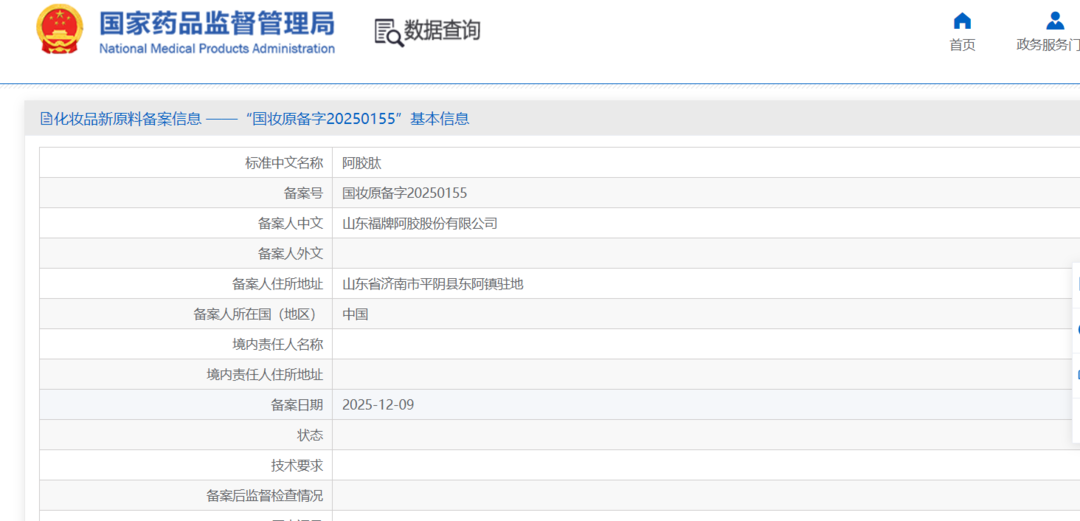 2025年,国家药品监督管理局化妆品新原料备案名录中,一个编号为“国妆原备字20250155”的成分引起行业关注:阿胶肽。这意味着拥有300余年品牌历史的福牌阿胶,领先拿到了进入美妆领域的“身份证”。