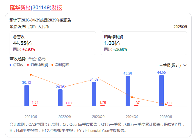 财报显示,隆华新材2025年前三季度营业收入为44.55亿元,同比增长2.93%;归母净利润为1.00亿元,同比下降26.60%;扣非归母净利润为8887.44万元。