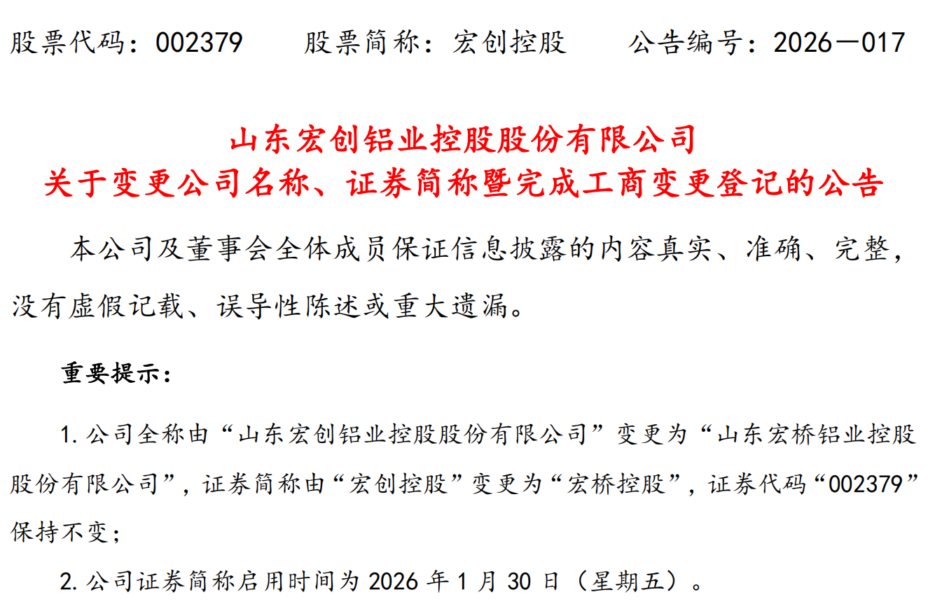 公告显示,公司全称由“山东宏创铝业控股股份有限公司”变更为“山东宏桥铝业控股股份有限公司”,证券简称由“宏创控股”变更为“宏桥控股”,证券代码保持002379不变,即日起正式启用新简称。