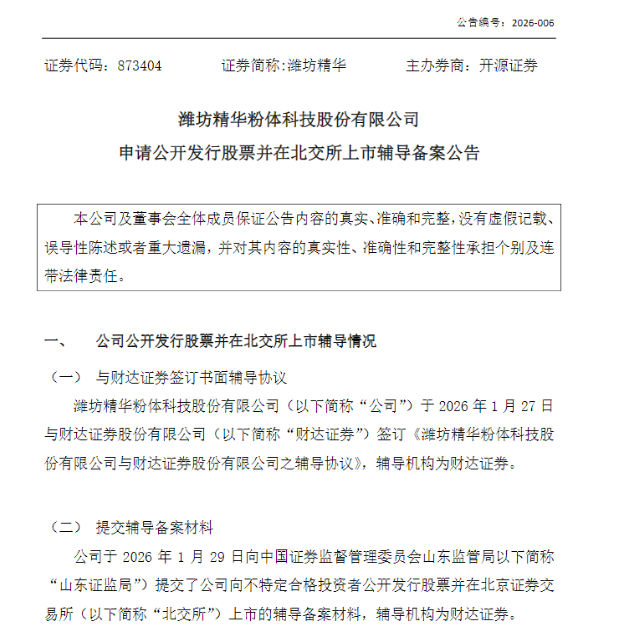 潍坊精华粉体科技股份有限公司(下称“潍坊精华”)日前披露称,公司1月27日与财达证券签订《辅导协议》,并于1月29日向山东证监局提交了向不特定合格投资者公开发行股票并在北交所上市的辅导备案材料,这意味着潍坊精华正式启动冲刺北交所上市。