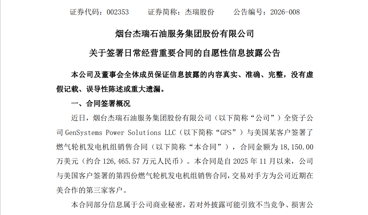 2月1日,杰瑞股份(002353.SZ)发布公告称,近日,公司全资子公司 GenSystems Power Solutions LLC(下称“GPS”)与美国某客户签署了燃气轮机发电机组销售合同(下称“本合同”),合同金额为1.82亿美元(约合 12.65亿元人民币)。