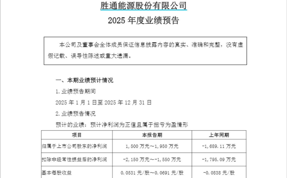 1月30日晚,胜通能源(001331.SZ)发布的2025年度业绩预告称,预计2025年度归母净利润为1500万元至1950万元,上年同期为-1689.11万元;预计扣非净利润为-2150万元至-1550万元,上年同期为-1795.09万元。