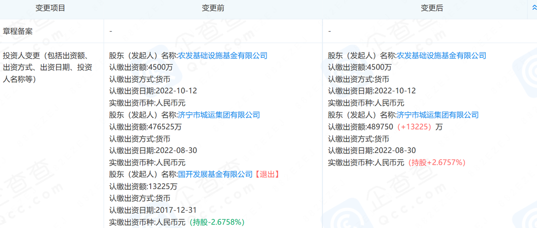 企查查信息显示,1月27日,国开发展基金退出任兴集团,退出前持股2.68%,认缴出资额为1.32亿元;变更后,济宁市城运集团有限公司持股比例为99.09%,认缴出资额增加至48.98亿元。任兴集团的剩余0.91%股份仍由农发基础设施基金有限公司持有。
