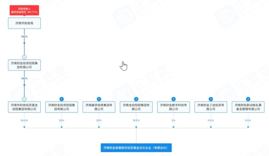 股权穿透显示,7家国企为该基金合伙人,分别是济南市财政投资基金控股集团有限公司、济南财金投资控股集团有限公司、济南融资担保集团有限公司、济南金投控股集团有限公司、济南财金数字科技有限公司、济南财金工信投资有限公司、济南财投新动能私募基金管理有限公司,出资比例分别为34.5%、20%、20%、19.5%、5%、0.5%、0.5%。