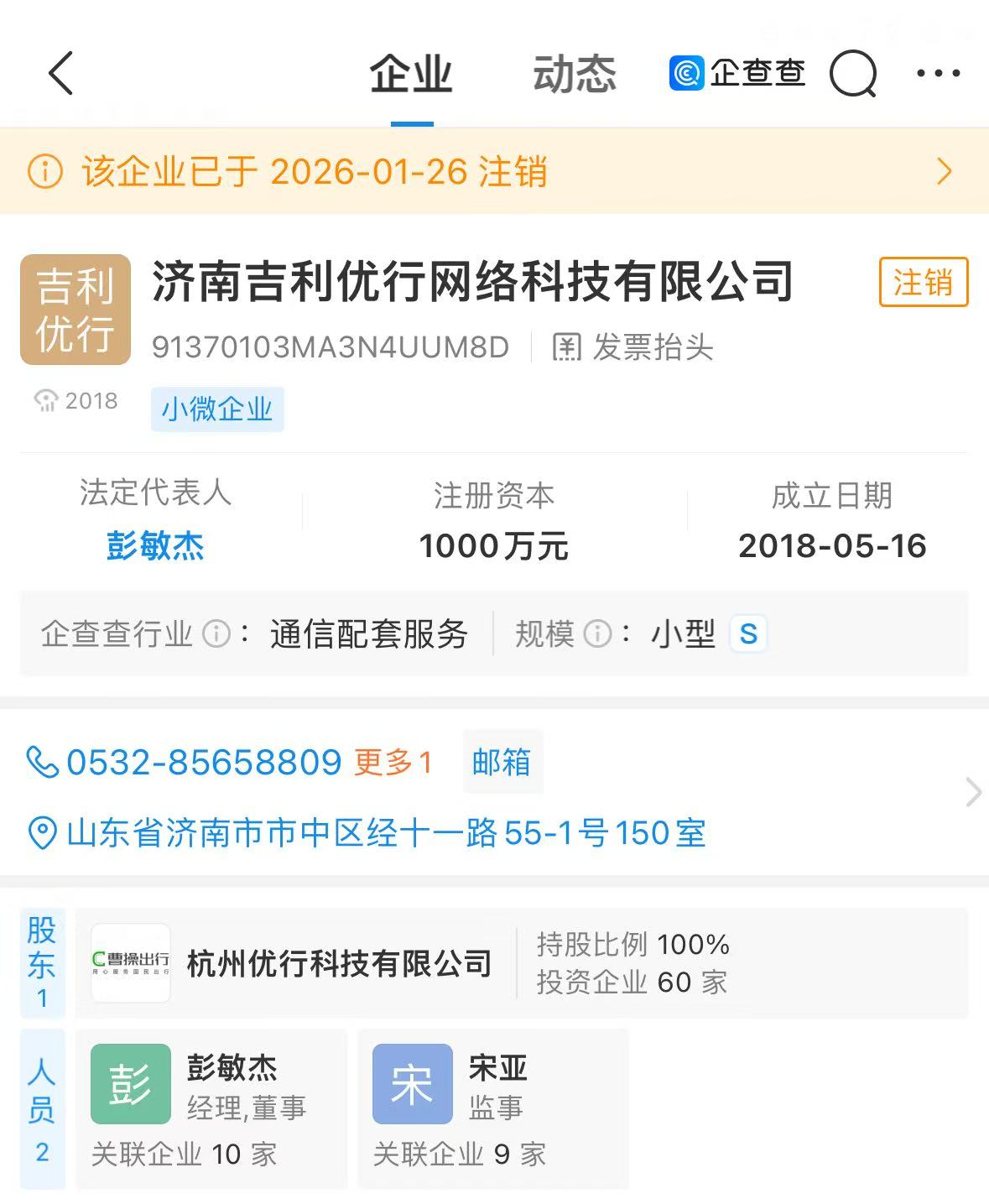 曹操出行收缩山东布局?济南吉利优行注销,仅剩青岛1家全资子公司