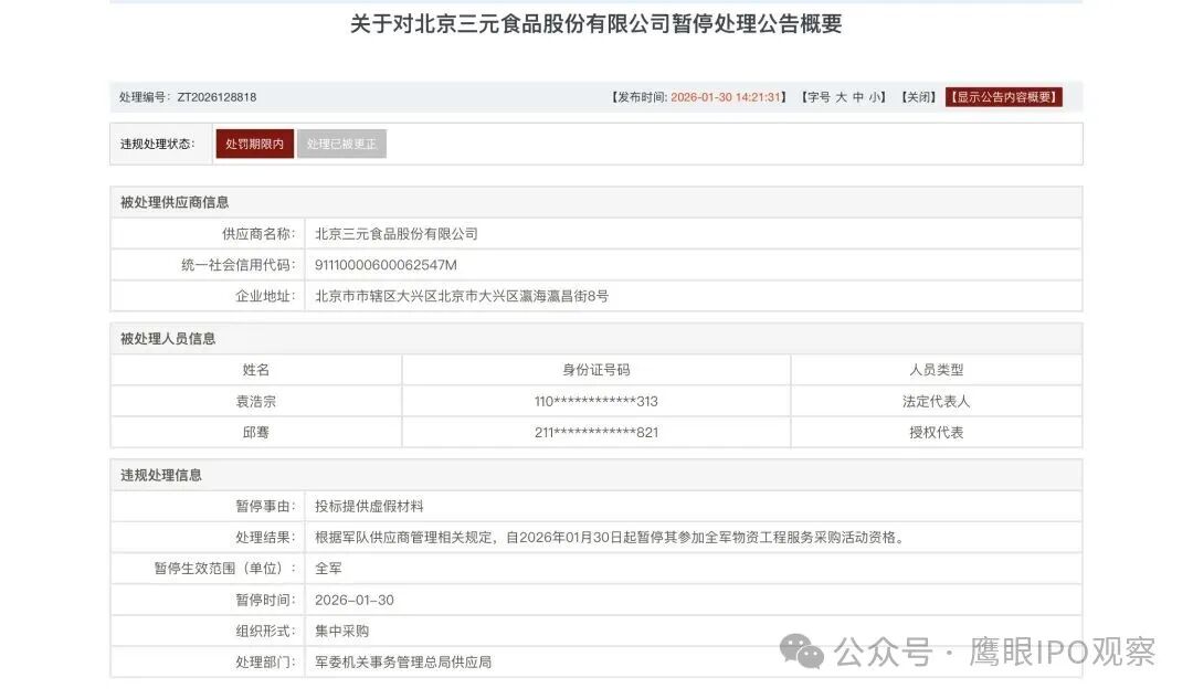 军队采购网日前发布公告,北京三元食品股份有限公司(下称“三元股份”,600429.SH)因在军队采购活动中存在违规失信行为,自2026年1月30日起被暂停参加全军物资工程服务采购活动资格。