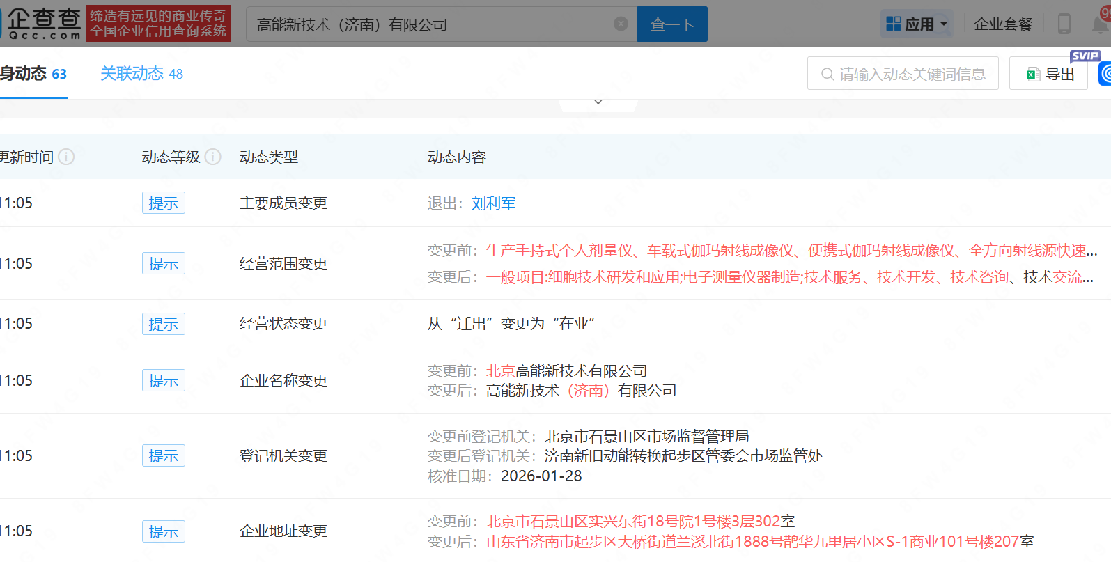 在迁入济南的同一时间,高能新技术经营范围也有所变更:由生产手持式个人剂量仪、车载式伽玛射线成像仪、便携式伽玛射线成像仪、全方向射线源快速定位仪等,变更为细胞技术研发和应用、电子测量仪器制造、计算机软硬件及辅助设备批发等。