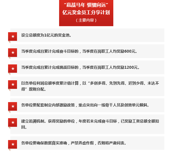 “设立总额度为1亿元的奖金池。”“赢战马年 骐骥向远”亿元奖金员工分享计划中如是提出。