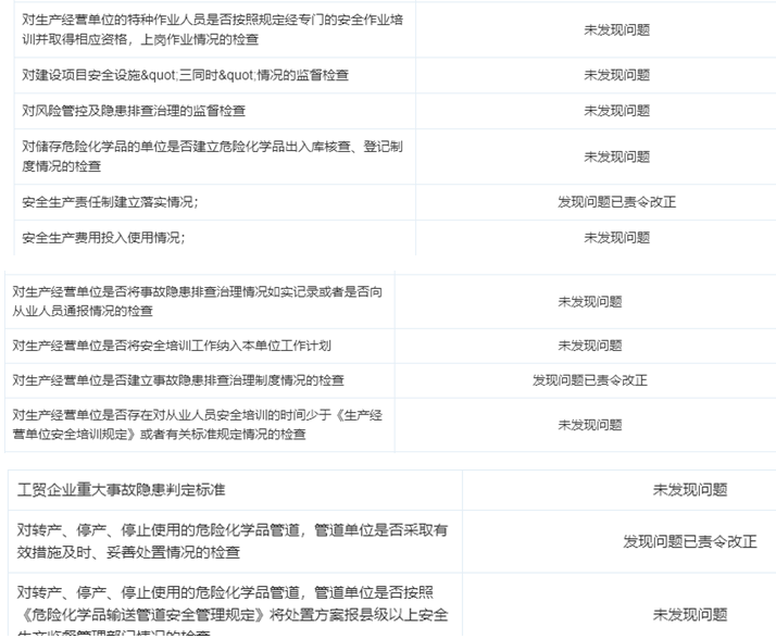 其中在2022年9月进行的不定向抽查中,嘉晨智能被查出“安全生产责任制落实情况”存在问题,并被责令改正;在2024年8月进行的定向抽查中,嘉晨智能在“对生产经营单位是否建立事故隐患排查治理制度情况”方面被查出存在问题并被责令改正;在2025年9月进行的定向抽查中,公司被查出在落实“对转产、停产、停止使用的危险化学品管道,管道单位是否按照《危险化学品输送管道安全管理规定》将处置方案报县级以上安全生产监督管理部门情况”方面存在问题并被责令改正。