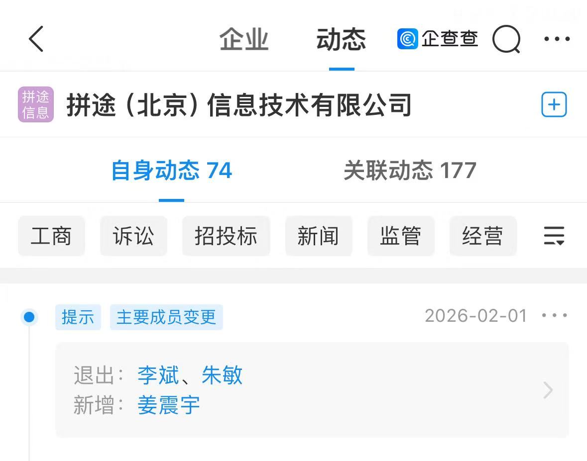 企查查信息显示,日前,嘀嗒出行(02559.HK)关联公司拼途(北京)信息技术有限公司(下称“北京拼途”)发生工商变更,蔚来汽车创始人、董事长兼CEO李斌卸任董事,朱敏卸任董事,新增姜震宇为财务负责人。
