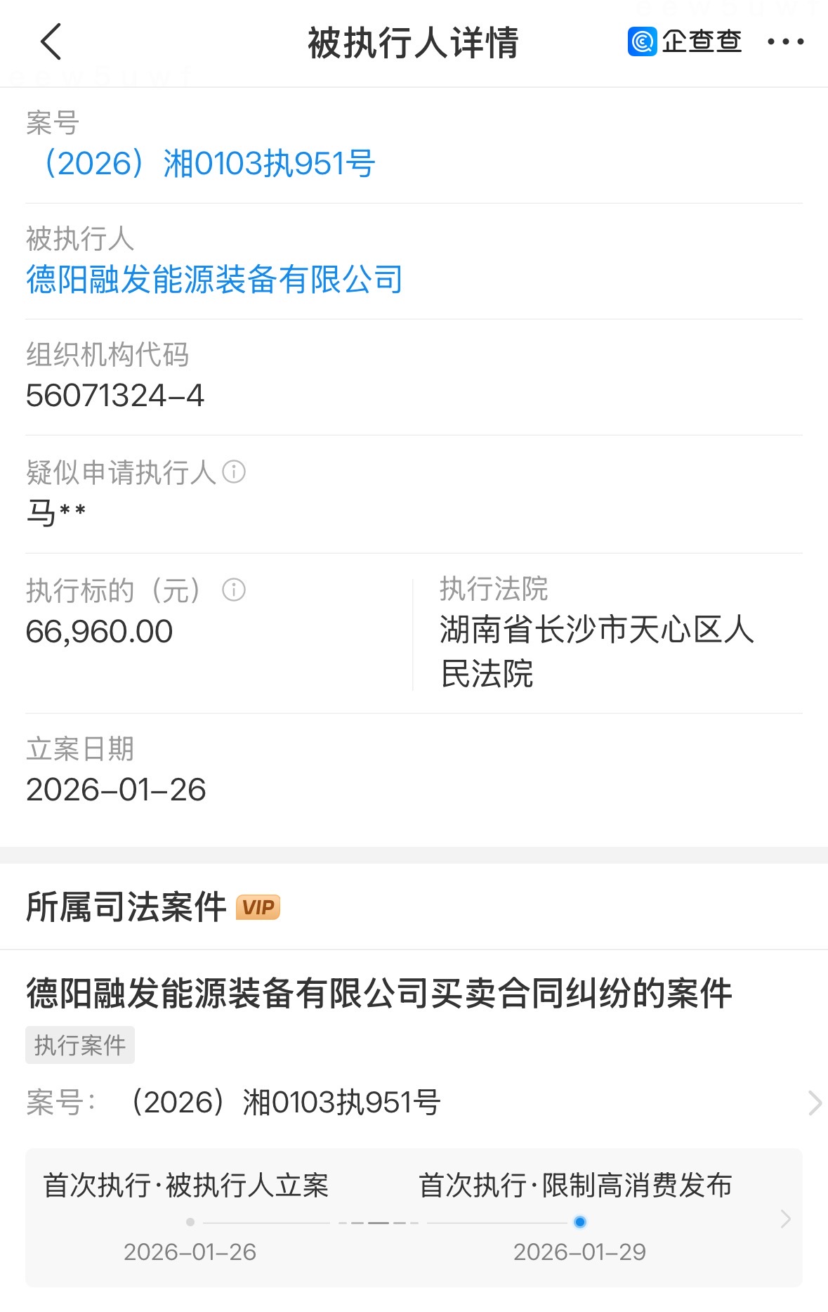 经济导报记者注意到,融发核电全资子公司德阳融发能源装备有限公司,因买卖合同纠纷,于1月26日被湖南省长沙市天心区人民法院列为被执行人,执行标的6.7万元。当天,德阳融发能源装备有限公司法定代表人孙军被限制高消费。