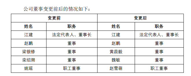公告提及,近日,根据公司股东决定,公司董事人员进行如下调整:梁银修、栾绍朔辞去公司董事职务,任命魏敏、黄菽毅为公司董事。同时,鉴于胶州城发职工代表大会已作出决议,免去姚瑶职工董事职务,并选举赵雪萌为公司职工董事。调整后,公司新一届董事会成员包括江建、赵雪萌、赵鹏、魏敏、黄菽毅。