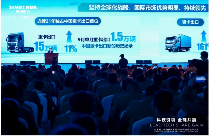 然而,突破纪录不易,超越自我更难。中国重汽在2026年开局之初的战略布局,清晰传递出“向更高目标冲刺”的坚定决心。面向2026年,中国重汽明确聚焦“产品、价值、生态、信任”四大关键词,为国际化发展再添新动能。在产品端,打造科技领先、性能卓越、质量可靠的产品矩阵,从研发、生产、供应链等多维度提升综合竞争力,精准匹配全球不同市场的差异化需求;在价值端,推动品牌持续向上、服务提效提质,落地“品牌即价值”“服务即价值”理念,让品牌认可与服务品质成为用户选择的核心理由;在生态端,聚焦新能源、二手车、金融、再制造等领域,构建可持续发展的产业生态,丰富合作伙伴的全价值链营销转型内涵;在合作端,升级厂商共赢理念,从团队建设、渠道赋能、市场开拓等维度加深信任,凝聚全球合作伙伴力量。